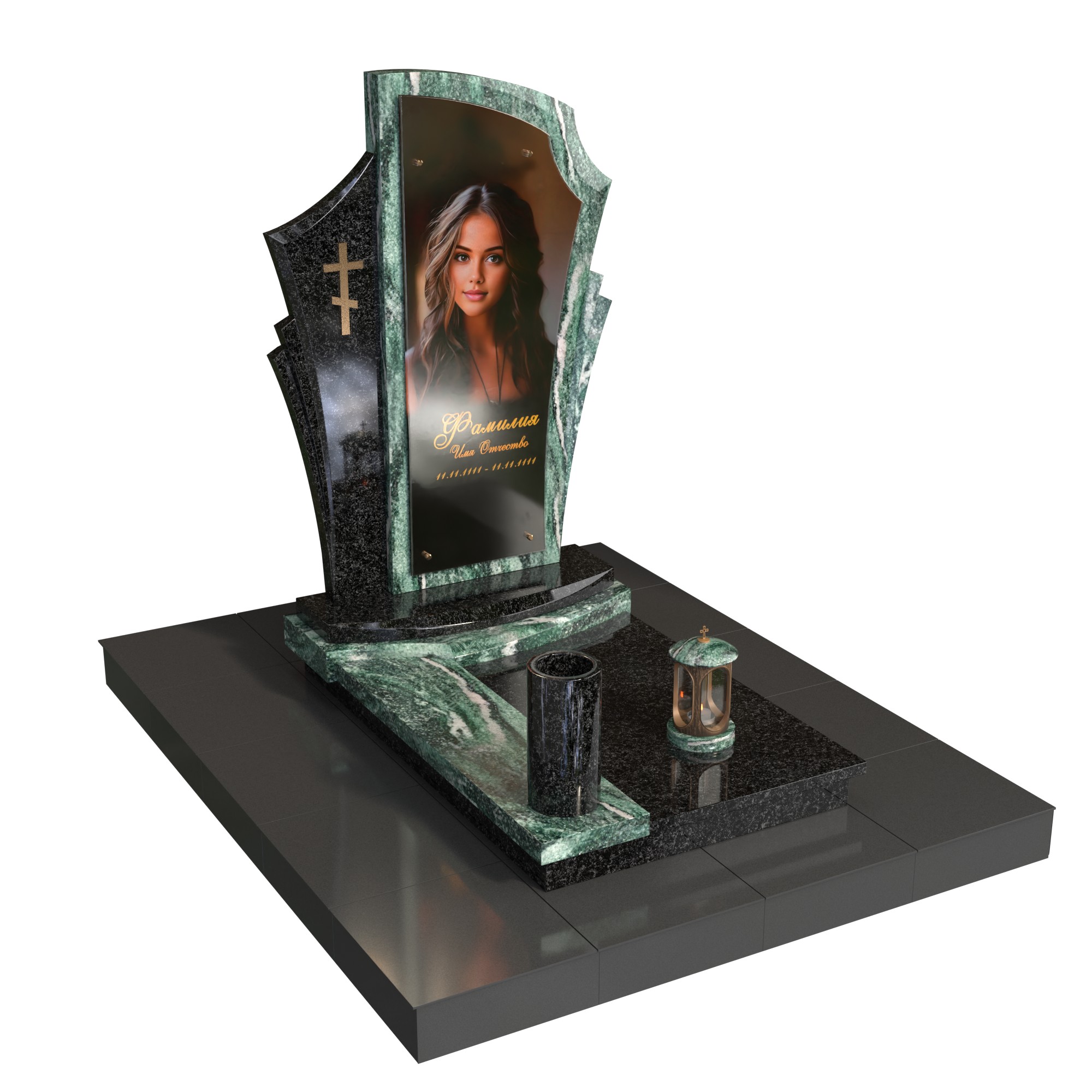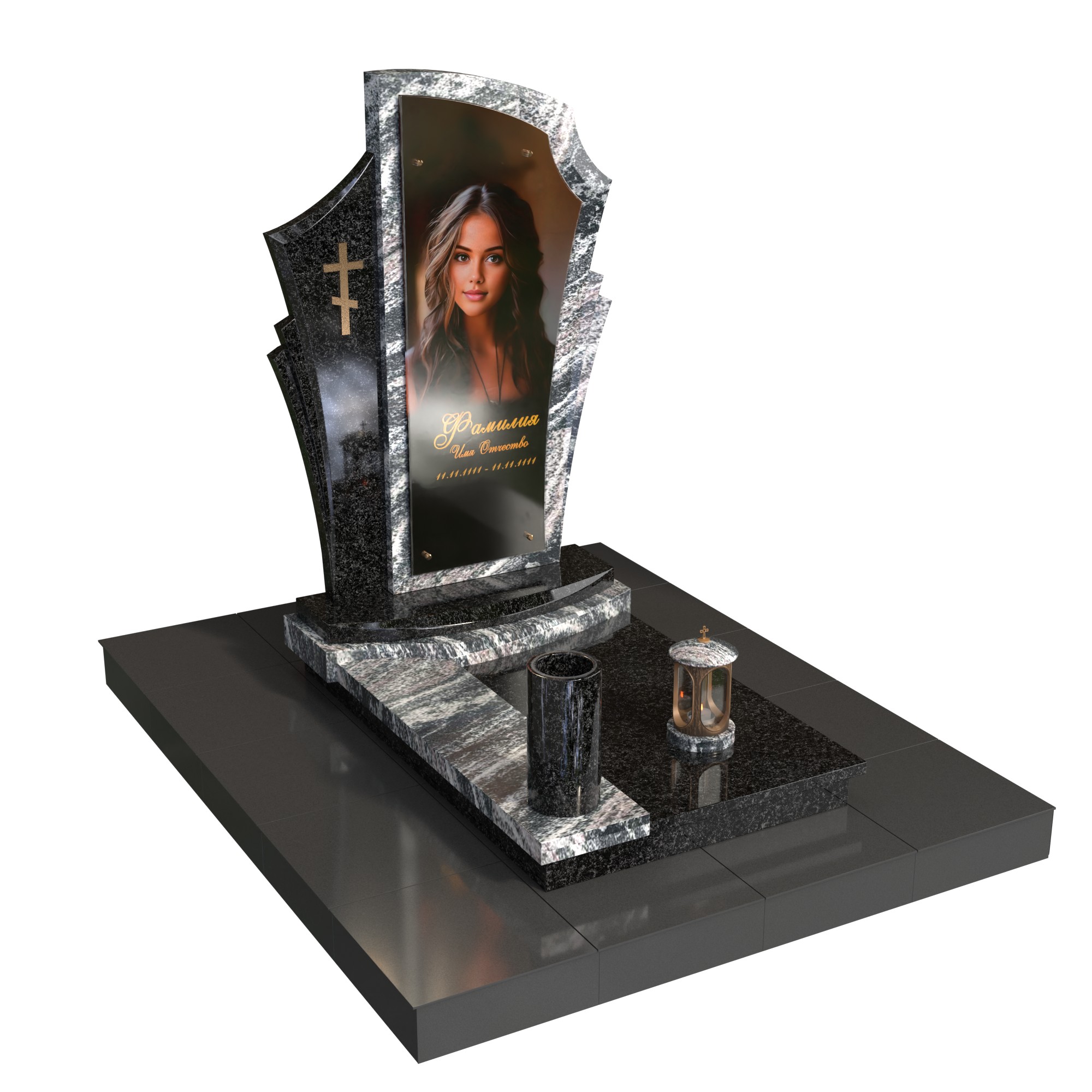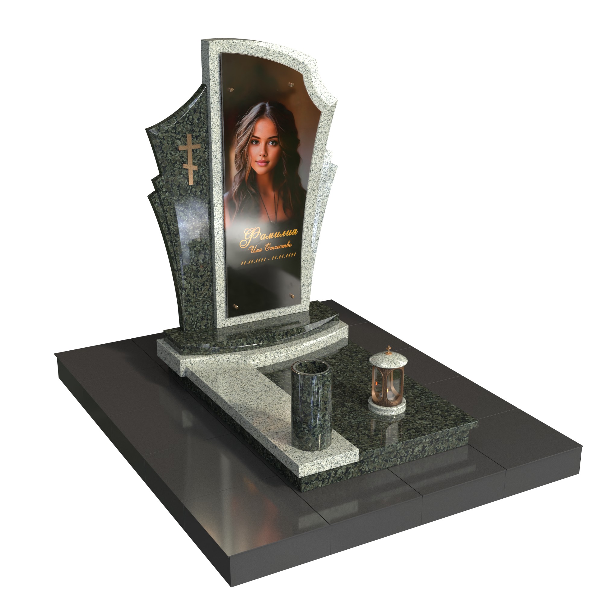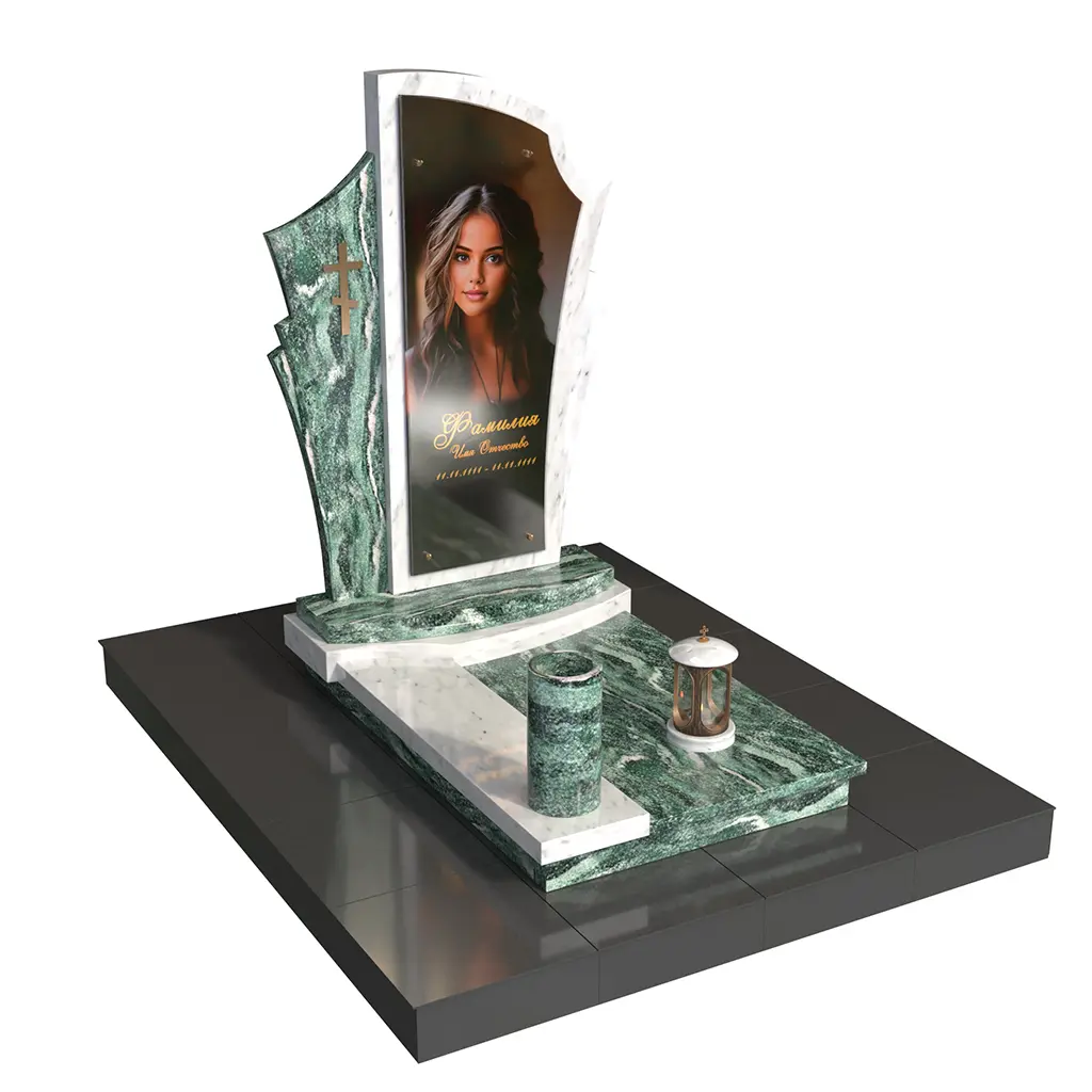 Памятник «Покров света» — современная авторская модель из натурального камня. Фигурная стела со светлым обрамлением и боковой плоскостью с аккуратным крестом образует изящный силуэт и подчёркивает фотопортрет на стекле (крепление на метизах). Двухуровневое основание, цилиндрическая ваза и лампада на подиуме создают цельную, ухоженную композицию.
