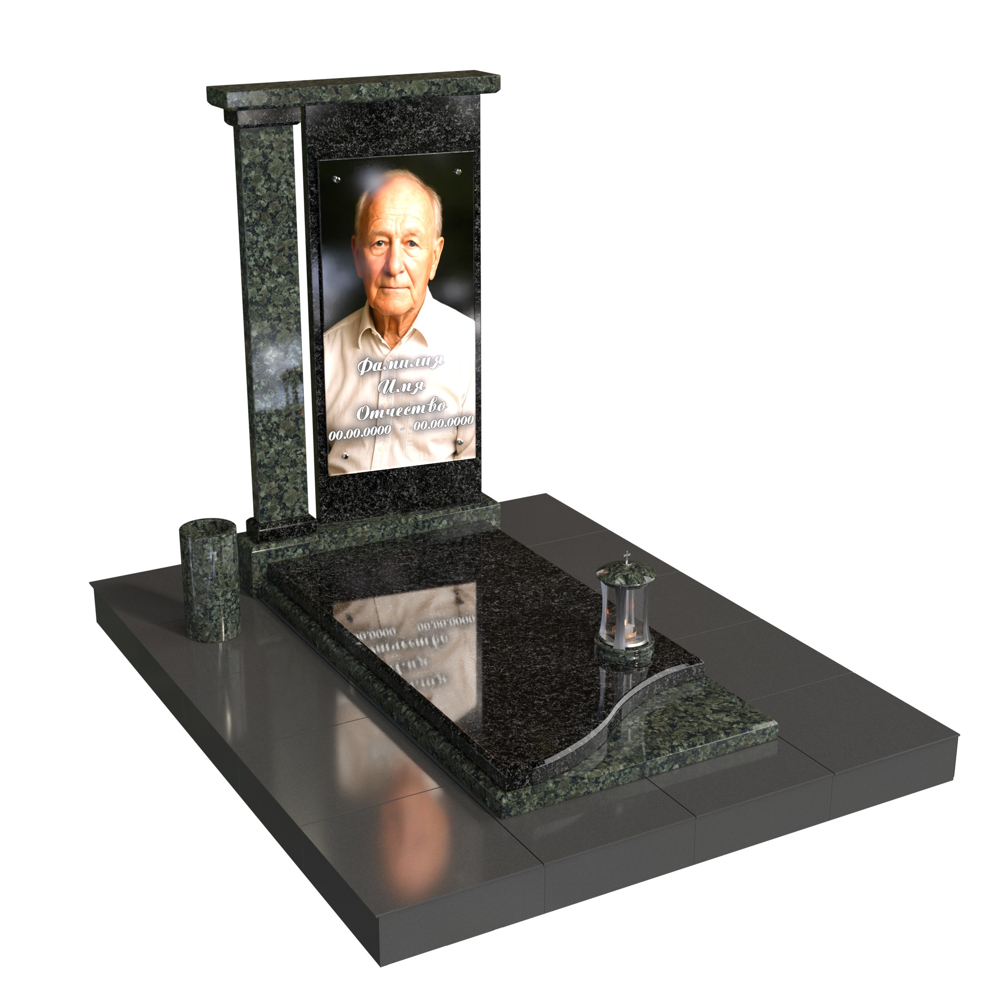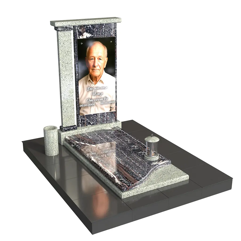 Надгробная плита плавной формы подчёркивает индивидуальность дизайна, а стеклянная лампада и округлая ваза завершают композицию, придавая ей завершённость и утончённость. Использование прочных и долговечных материалов гарантирует сохранность памятника на долгие годы.